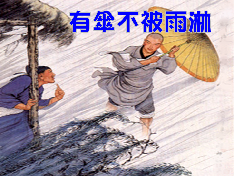 有一個信者,在屋簷下躲雨,看見一位禪師撐著雨傘走過來,信者向禪師喊說:『禪師啊!普度一下眾生吧!度我一程好嗎?』