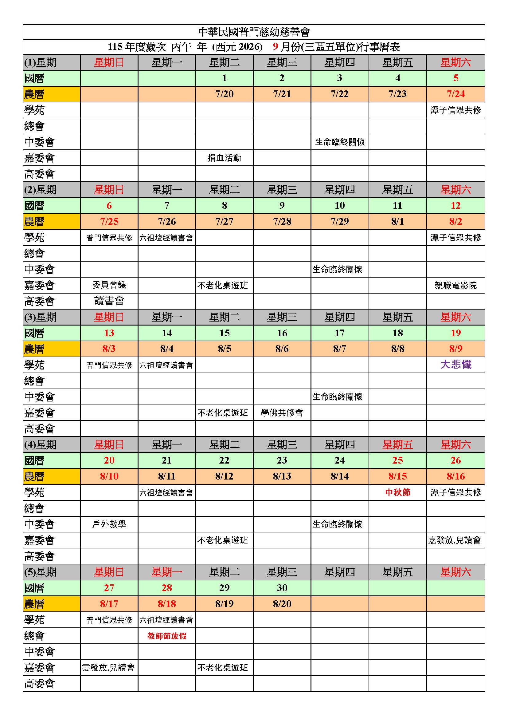 115年九月行事曆