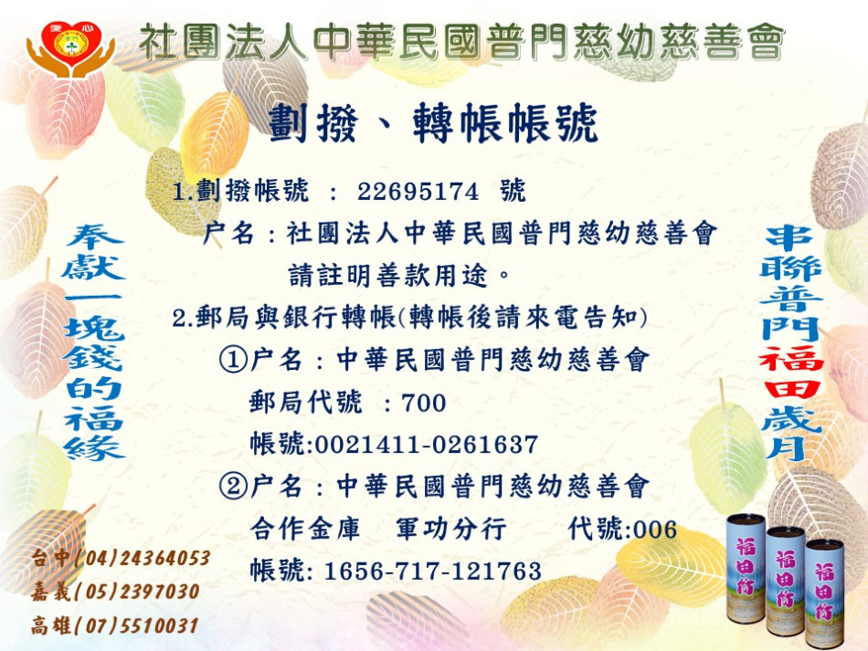 戶名 : 中華民國普門慈幼慈善會